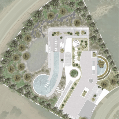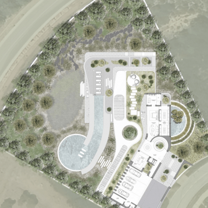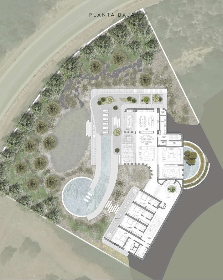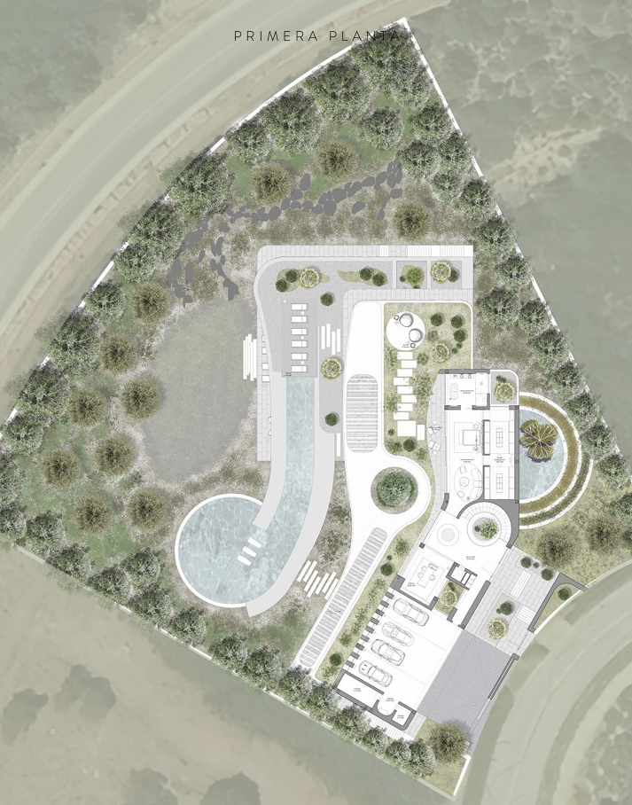 Its curved structure will echo the shape of the land, creating a continuous dialogue between indoors and outdoors. Materials such as stone, wood and glass will give the house a natural and timeless appearance.